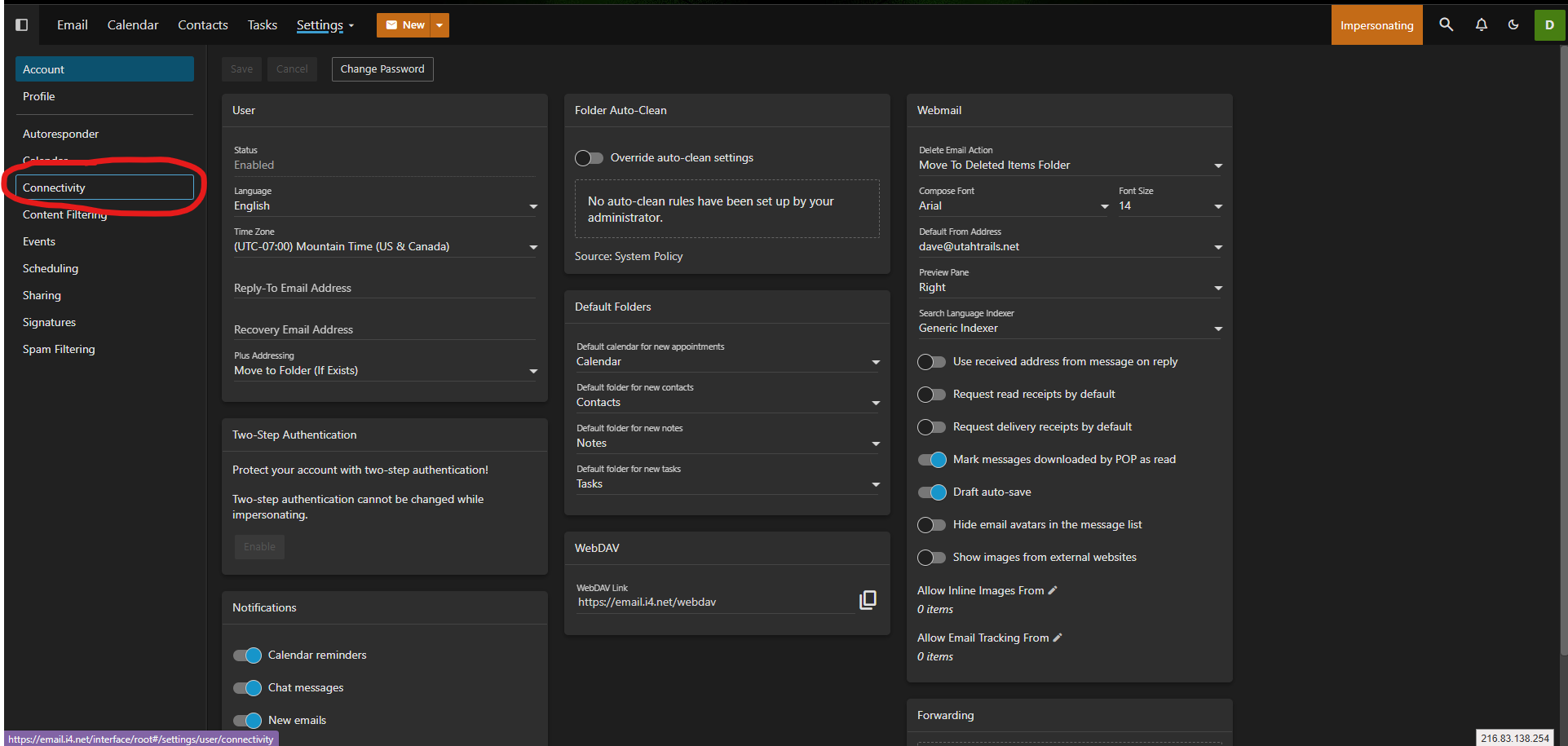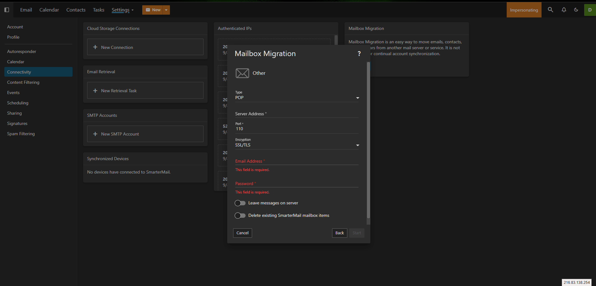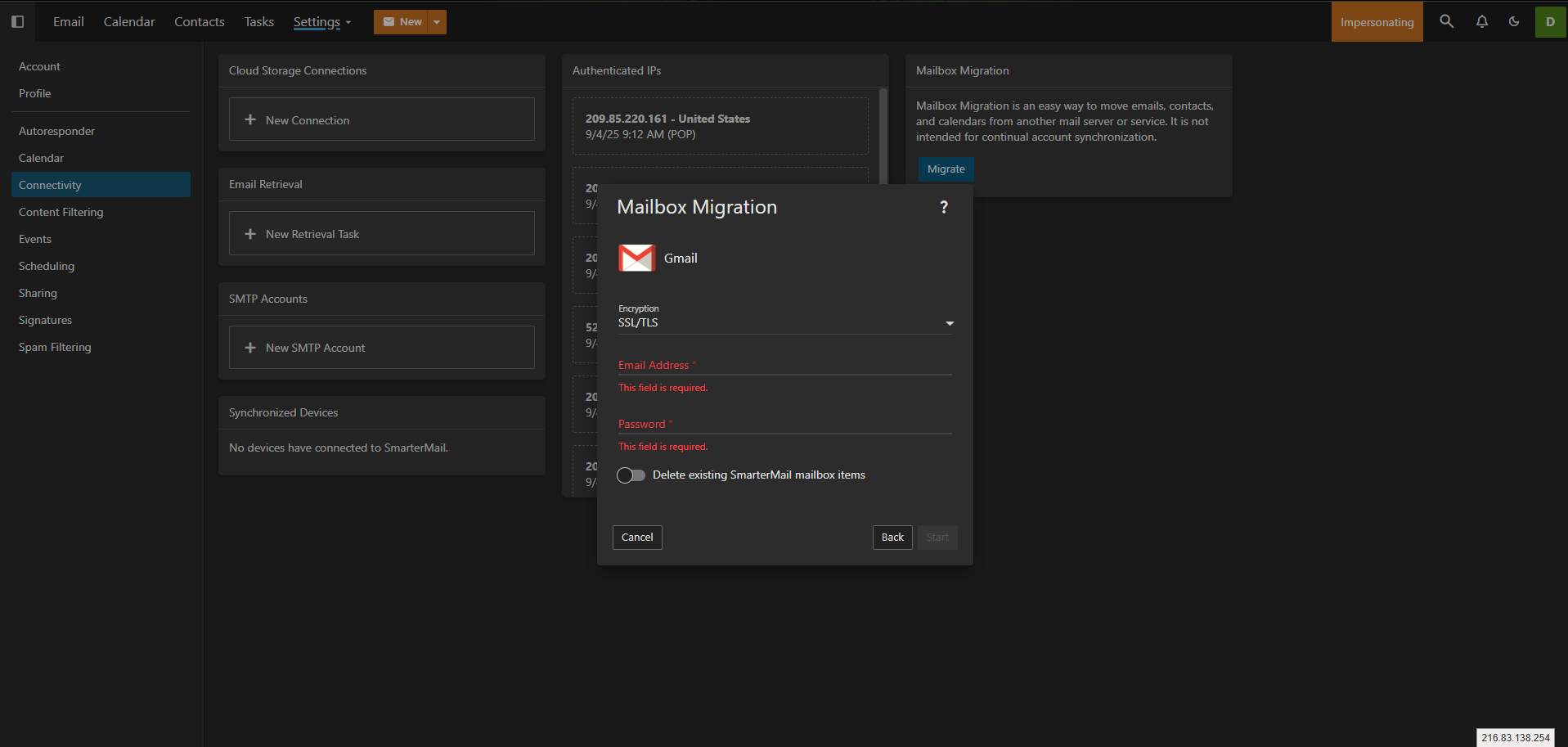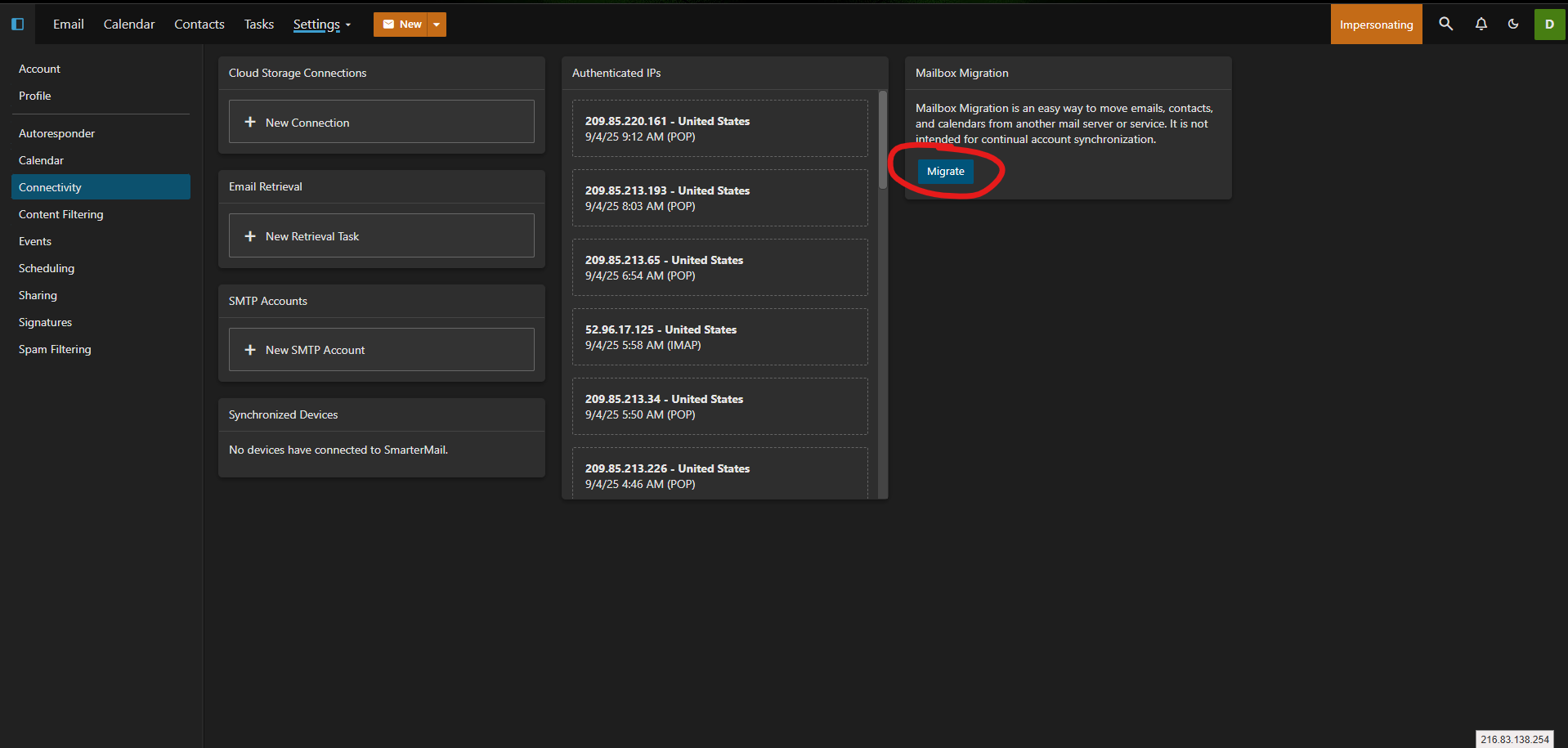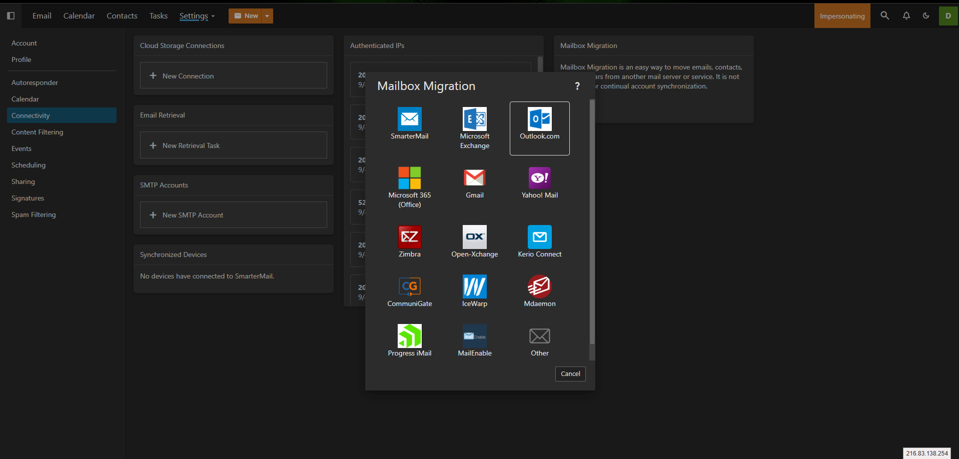 To access the mailbox migration tool, click the Settings icon. (See Screenshot 1 - if you don't see settings then refer to screenshot 1a to access the settings) Then click on Connectivity (screenshot 2) from the navigation pane. Here you'll see a Mailbox Migration card. Clicking on the Migrate button (screenshot 3) will open a modal window (screenshot 4).