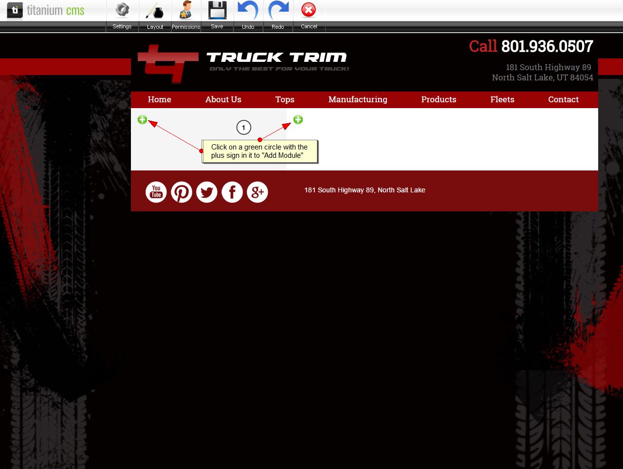 - Click on one of the green circles with the white plus sign to “Add Module” or click on "Layout", in the top, to change the page layout and then add a module.