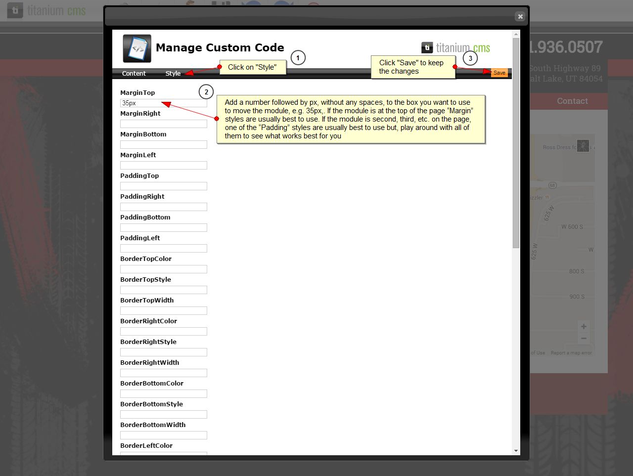 - If the map is too close to or too far away from another module: “Edit Page”, hover over the module and click “Edit”, and click on “Style” in the upper left corner. In the box you want to use to move the module add a positive number followed by px to increase space or a negative number followed by px to decrease space, e.g. 35px or -35px. If the module is at the top of the page “Margin” styles are usually best to use. If the module is second, third, etc. on the page, one of the “Padding” styles are usually best to use but, play around with all of them to see what works best for you.