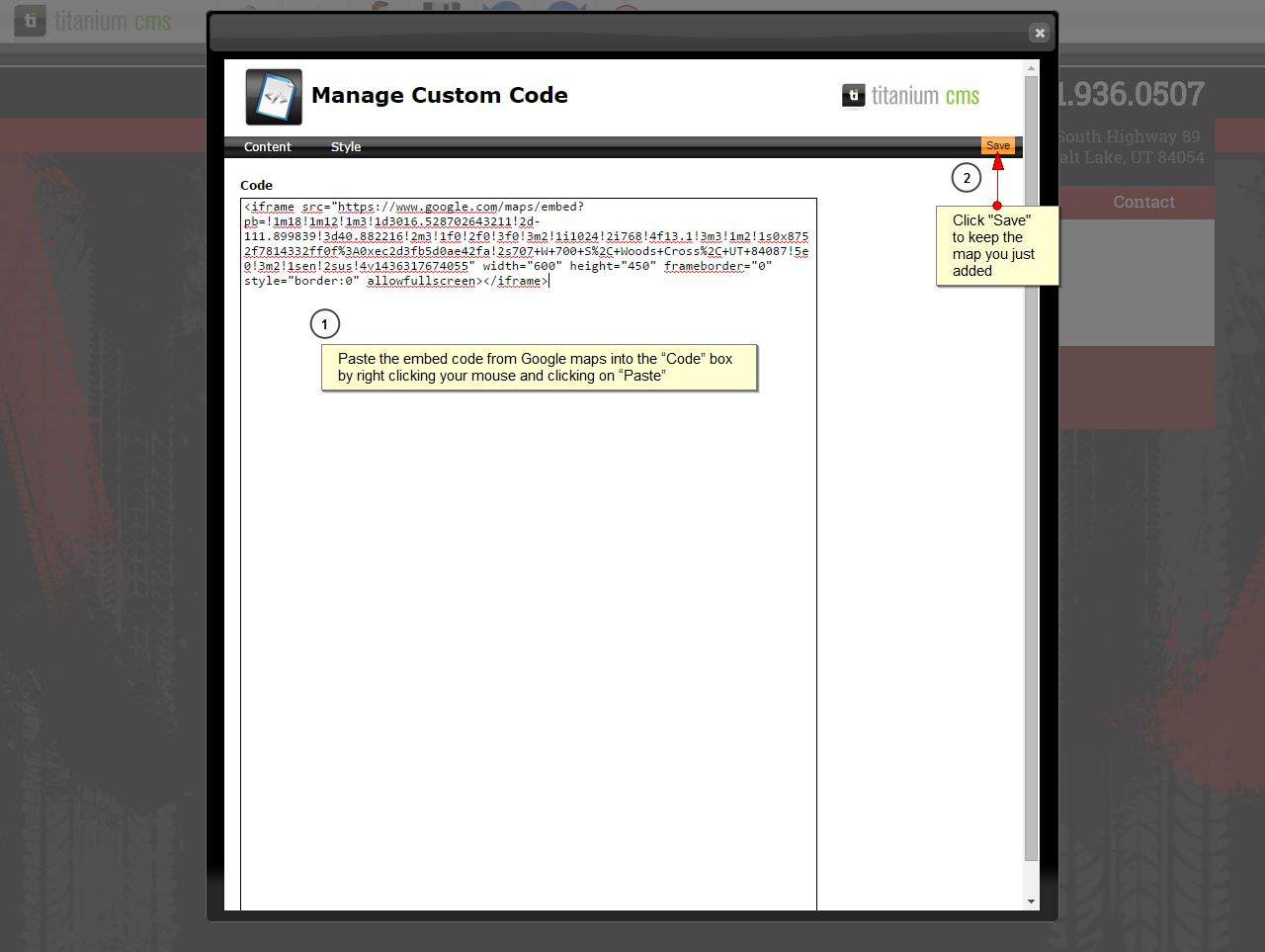 - Paste the embed code from Google maps into the “Code” box by right clicking your mouse and clicking on “Paste”.